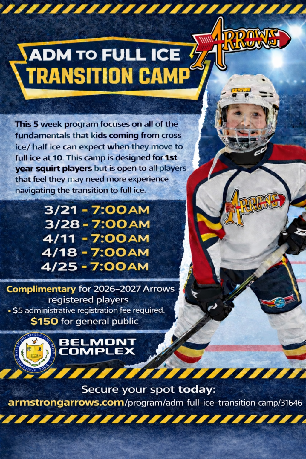 This 5 week program focuses on all of the fundamentals that kids coming from cross ice/half ice can expect when they move to full ice at 10. This camp is designed for 1st year squirt players but is open to all players that feel they may need more experience navigating the transition to full ice.