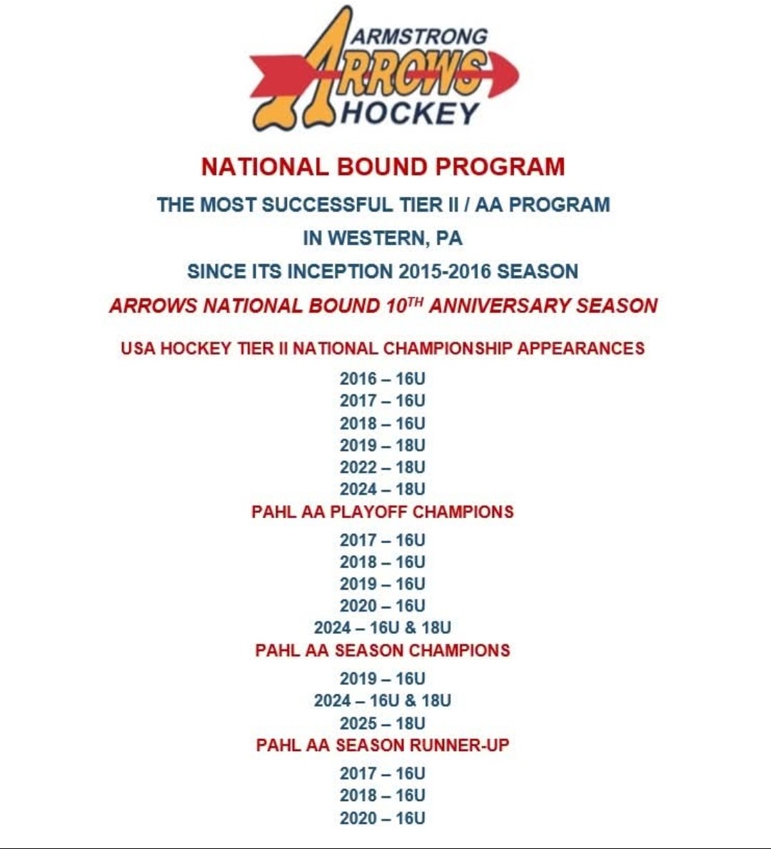 The Armstrong Arrows National Bound Program is an Elite Tier II Hockey Program with the intent of their teams competing for the USA Hockey Tier II National Championships each year. This is the Armstrong Arrows National Bound Program’s 10th year of existence. The 16U National Bound Team qualified for the USA Hockey Tier II National Championships in 2016, 2017 & 2018. The 18U National Bound Team qualified for the 2019, 2022 and most recently 2024 USA Hockey Tier II National Championships. In just the first season, the newly formed 16U National Bound Team made it to the USA Hockey Tier II National Championship Game!